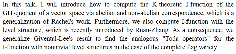 冬季几何物理研讨讲座1:K-theoretic I-function of V//G and its applications