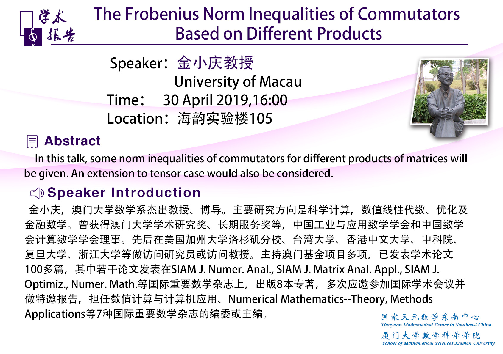 Speaker Introduction:金小庆,澳门大学数学系杰出教授、博导。主要研究方向是科学计算,数值线性代数、优化及金融数学。曾获得澳门大学学术研究奖、长期服务奖等,中国工业与应用数学学会和中国数学会计算数学学会理事。先后在美国加州大学洛杉矶分校、台湾大学、香港中文大学、中科院、复旦大学、浙江大学等做访问研究员或访问教授。主持澳门基金项目多项,已发表学术论文100多篇,其中若干论文发表在SIAM J. Numer. Anal., SIAM J. Matrix Anal. Appl., SIAM J. Optimiz., Numer. Math.等国际重要数学杂志上,出版8本专著,多次应邀参加国际学术会议并做特邀报告,担任数值计算与计算机应用、Numerical Mathematics--Theory, Methods Applications等7种国际重要数学杂志的编委或主编。