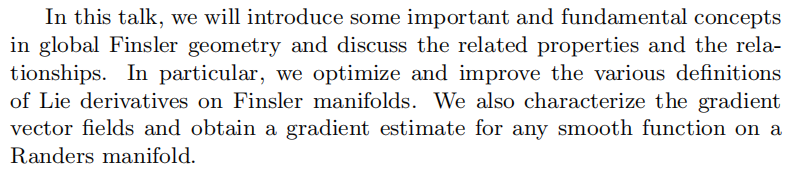 Speaker Introduction:程新跃,重庆师范大学数学科学学院二级教授、数学研究所所长,博士生导师,重庆市学术技术带头人。研究领域为整体微分几何及几何分析,主要研究方向包括黎曼-芬斯勒几何、流形上的分析、信息几何学。已在包括<<Journal of London Mathematical Society>>, << Israel Journal of Mathematics >>,<<SCIENCE CHINA Mathematics >>, <<Annals of Global Analysis Geometry>>,<<Results in Mathematics>>等国际重要学术期刊在内的学术期刊上发表论文90余篇;与著名美籍华人数学家沈忠民合著的学术专著<< Finsler Geometry-- An Approach via Randers Spaces >>由德国Springer出版社与科学出版社联合出版。近年来,先后主持国家自然科学基金项目六项;作为项目负责人获2010年度重庆市自然科学奖二等奖一项。
