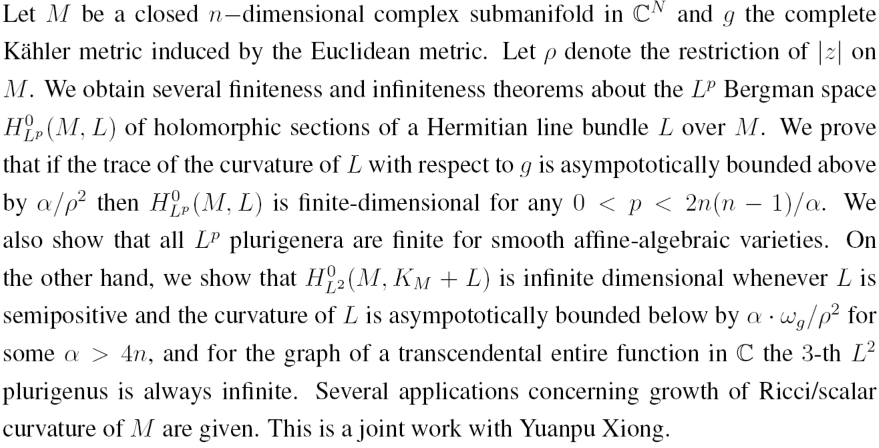 Speaker Introduction:陈伯勇,复旦大学数学科学学院教授、博士生导师。从事多复变函数论研究。2003年获全国优秀博士论文,2006年入选教育部新世纪优秀人才支持计划。在Bergmann度量的完备性等方面做出了一系列重要工作。研究论文发表在J. Differential Geom., Adv. Math., Math. Ann., Trans. Amer. Math.Soc., Math. Z., J. Geom. Anal.等国际著名数学期刊。