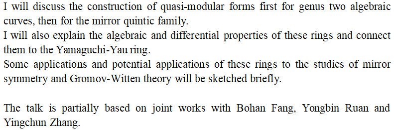 冬季几何物理研讨讲座3:On quasi-modular forms for genus two algebraic curves and for mirror quintics