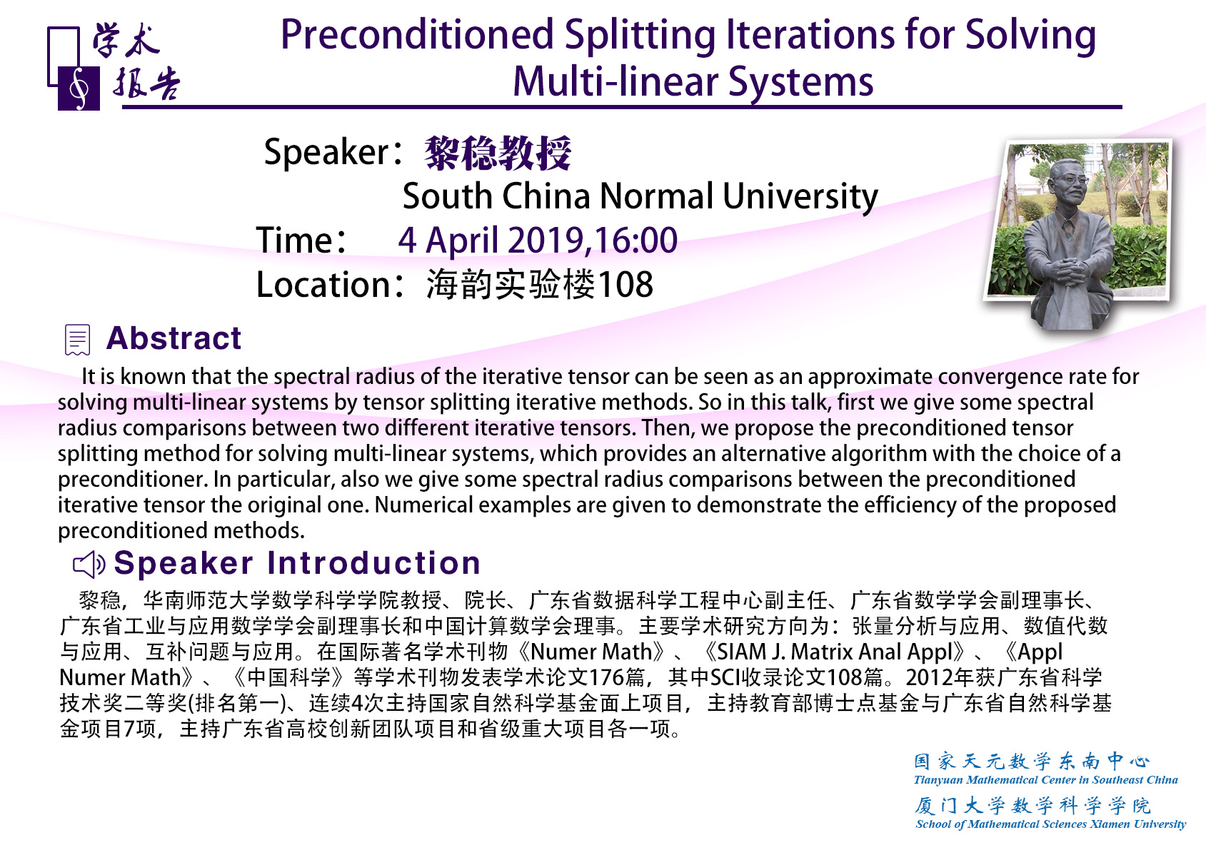 Speaker Introduction:黎稳,华南师范大学数学科学学院教授、院长、广东省数据科学工程中心副主任、广东省数学学会副理事长、广东省工业与应用数学学会副理事长和中国计算数学会理事。主要学术研究方向为:张量分析与应用、数值代数与应用、互补问题与应用。在国际著名学术刊物《Numer Math》、《SIAM J. Matrix Anal Appl》、《Appl Numer Math》、《中国科学》等学术刊物发表学术论文176篇,其中SCI收录论文108篇。2012年获广东省科学技术奖二等奖(排名第一)、连续4次主持国家自然科学基金面上项目,主持教育部博士点基金与广东省自然科学基金项目7项,主持广东省高校创新团队项目和省级重大项目各一项。