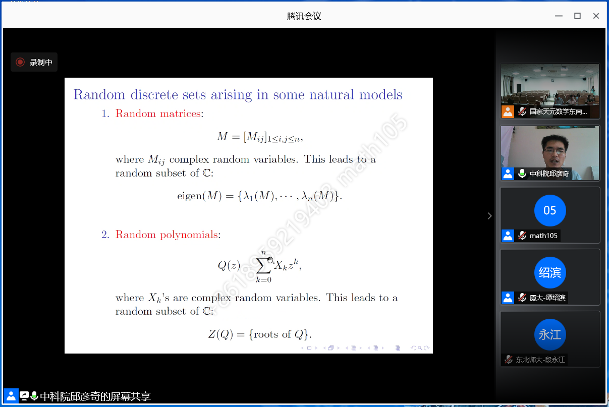 在本期讲座中,邱彦奇教授报告了复领域(例如d维复欧氏空间的闭单位球)上的解析函数和该领域上的随机离散子集之间的相互作用。邱彦奇教授就如何在一个与解析函数空间紧密联系的复领域上生成随机离散子集的问题进行了详细的论述,并且对一个限制在由概率测度生成的经典离散子集上的解析函数进行重构的问题展开了详尽的阐述。在报告中,邱彦奇教授还介绍了自己及其合作者在这两个问题取得的研究成果,并提出了有待解决的相关问题。讲座结束后,邱彦奇教授与线上的与会专家们就相关领域问题进行了热烈讨论,并对与会专家们提出的疑惑进行了耐心地解答。