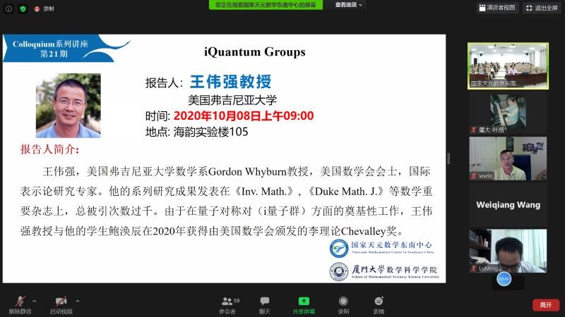 10月8日上午,应国家天元数学东南中心邀请,弗吉尼亚大学王伟强教授为我院师生做了题为《iQuantum Groups》的Colloquium学术讲座,讲座由数学科学学院林亚南教授主持。主会场在东南中心会议室举行,讲座同时线上直播,国内外数十位专家学者参加了讲座。